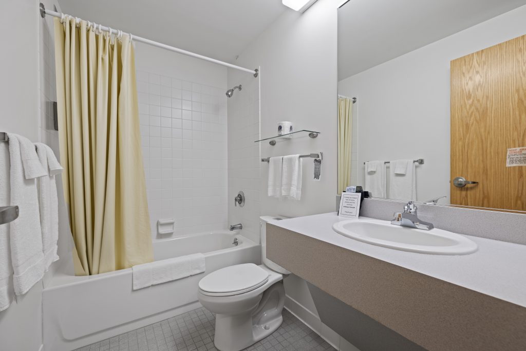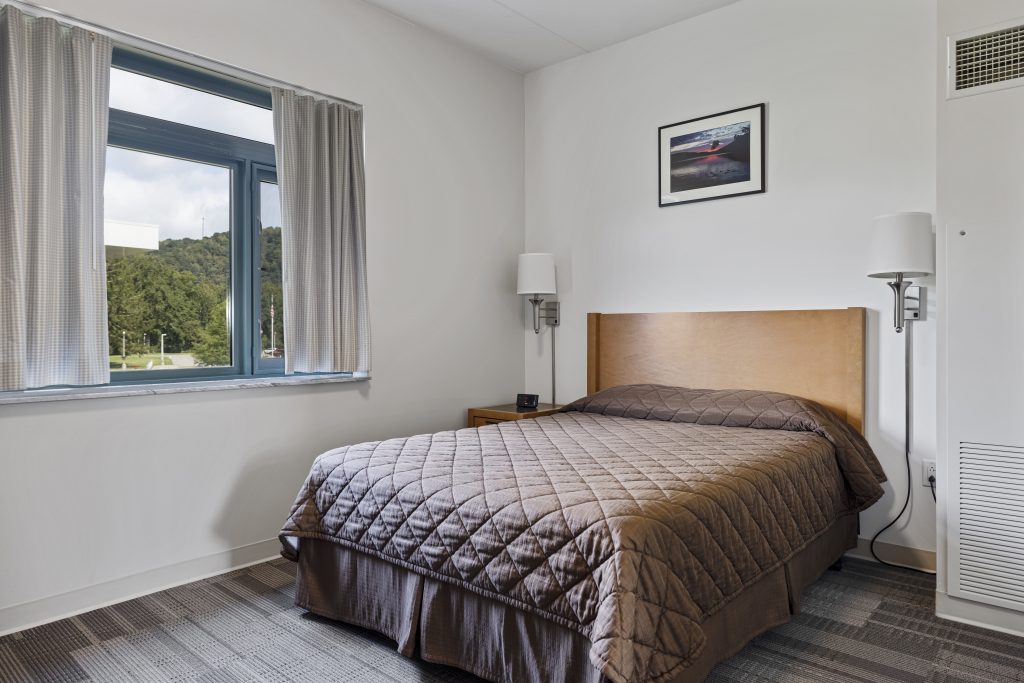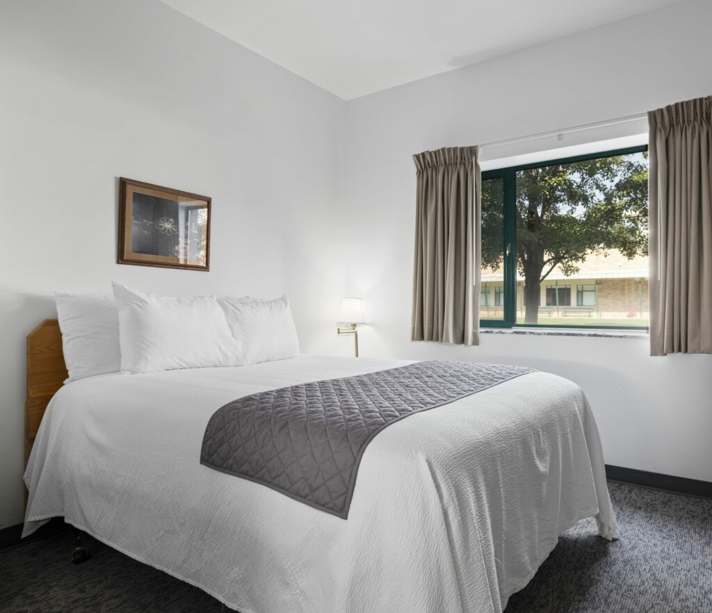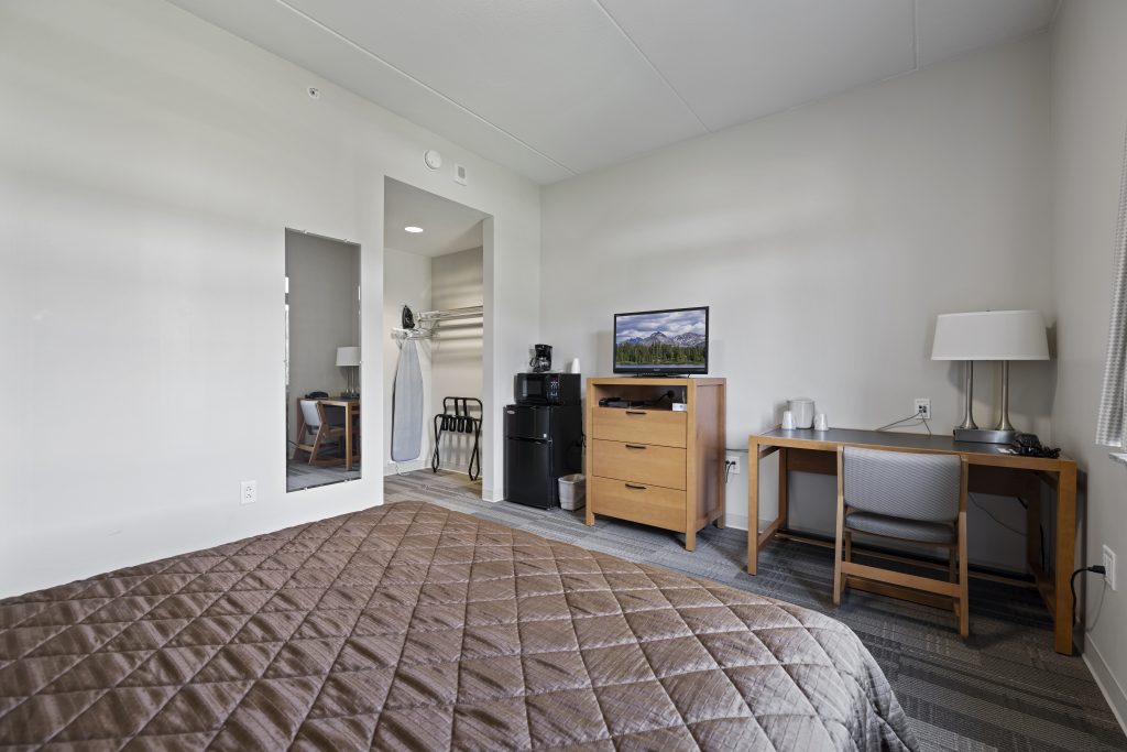 A single room features one queen bed and a private bathroom. Amenities include a television, wireless, mini-fridge, microwave, coffee pot, iron, and a hairdryer.